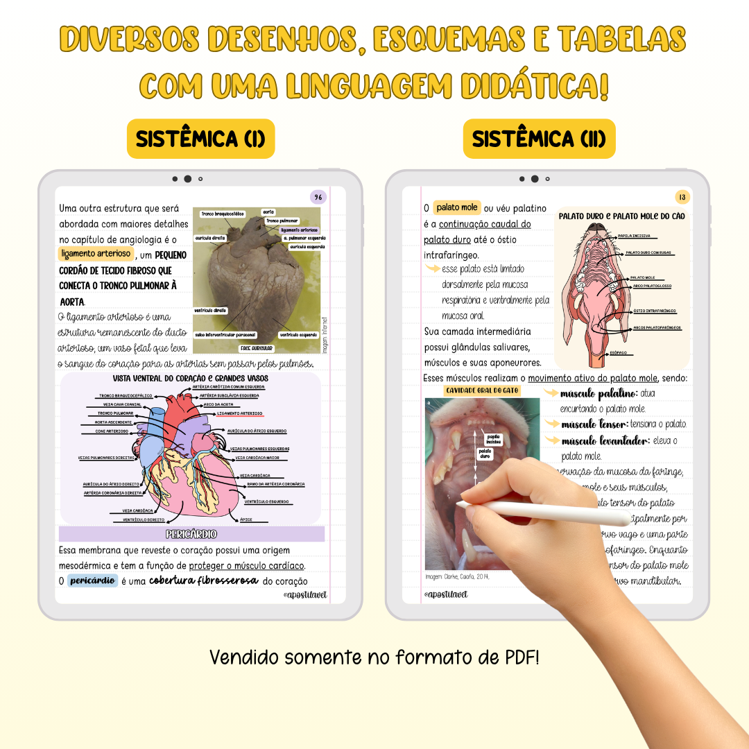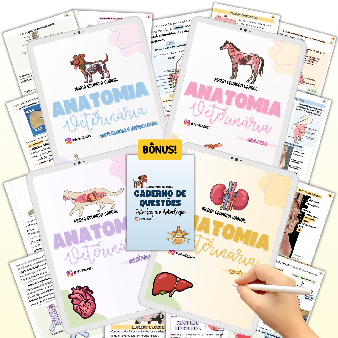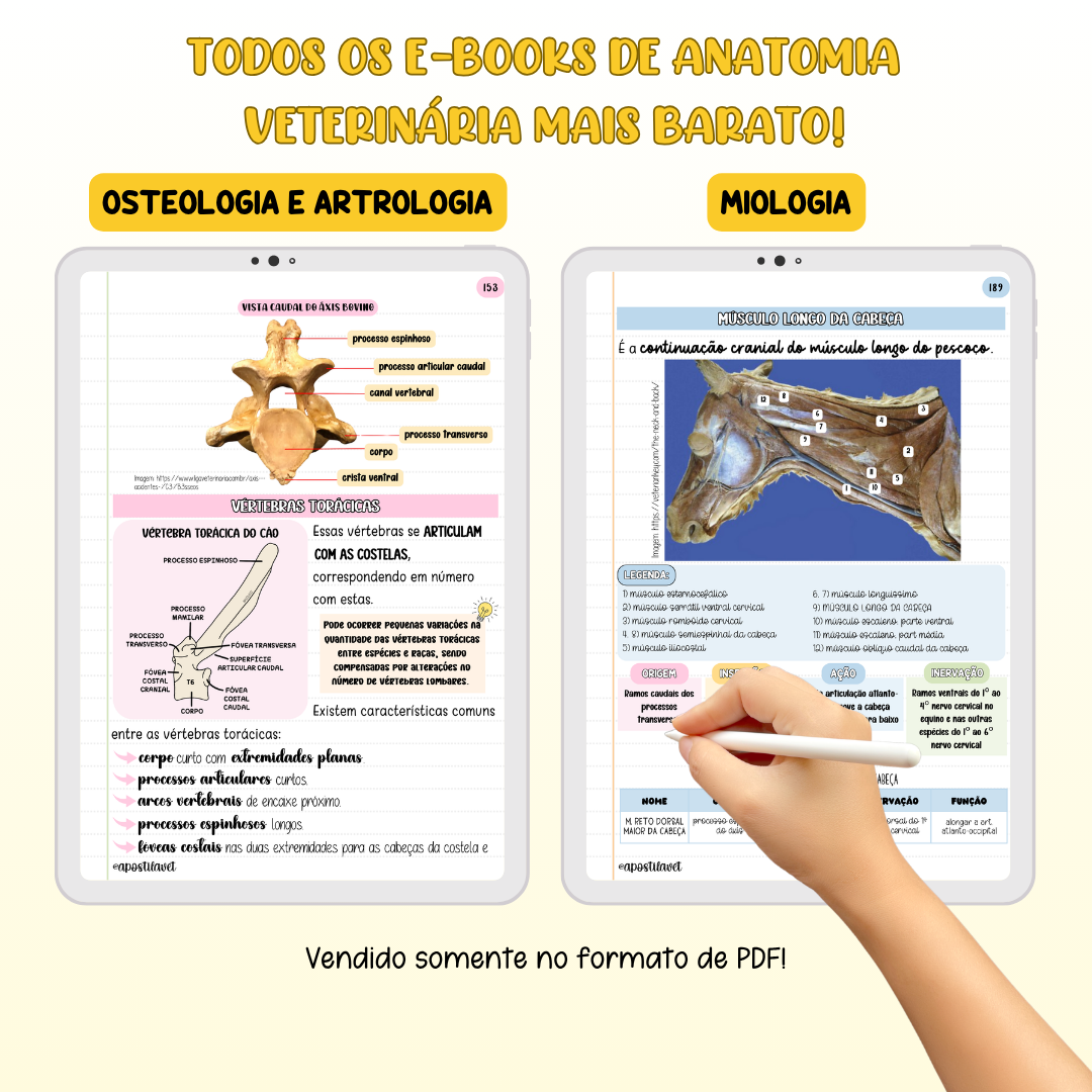 Esse e-book irá abordar todos os conteúdos das partes de Anatomia Veterinária que vendemos separado também, então inclui osteologia, artrologia, miologia e sistêmica em um único PDF e mais barato do que comprar cada parte separada. Cada parte acompanha um caderno de questões de brinde!
