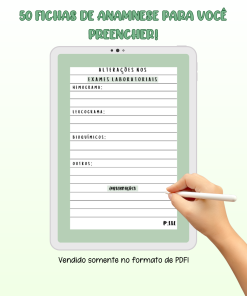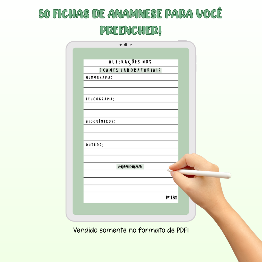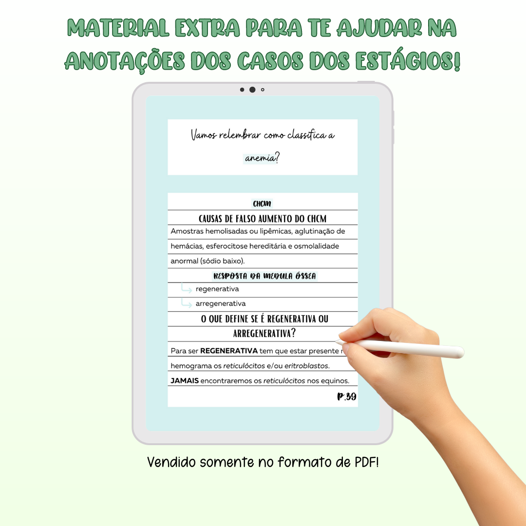 É um e-book voltado para anotações dos casos clínicos acompanhados no estágio, com fichas de anamnese, exame físico, exames laboratoriais, exames de imagem, diagnósticos diferenciais e tratamento.